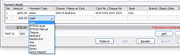 The amount outstanding is displayed to the bottom-right of the Payment Details section, as shown in the example above; If an amount is still owed after payments have been made, the owed amount is displayed in red.
