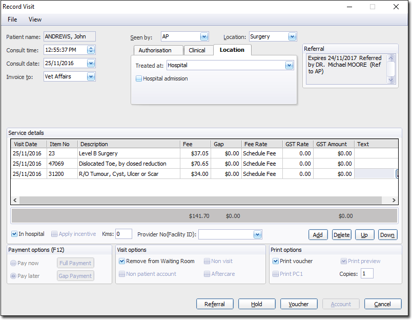 - Indicate whether you want to print a voucher via the Print Voucher check box. You might disable this if for example you need to edit the voucher, or perhaps you have printed them a voucher already (on a blank DB4) and are now billing the patient.