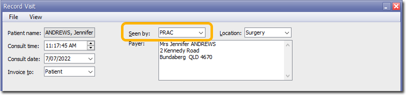 The process for billing a patient for services/sundries by your Practice is much the same as that for a Practitioner, except that in the Seen By field, you select the Practice's 'entity' user account. See Recording Visits for information on how to record various visit types in Pracsoft.