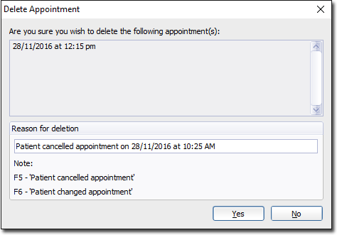 In Reason for Deletion, enter a reason such as Patient needed to reschedule and click Yes.Tip:This deletion prompt can be disabled in Appointment Book Options.Press F6 to enter the text Patient Changed Appointment. -