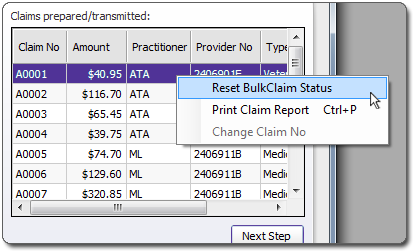 Within the Claims Prepared / Transmitted section on the right-hand side of this window, locate and right-click the claim you want to reset. From the menu that appears, select Reset Bulk Claim Status.