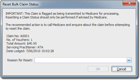 Note that the Reset Bulk Claim Status option will be unavailable if there are any AIR claims, or claims without a transmitted status within the selection you made. The Reset Bulk Claim Status window appears. Note that this window differs slightly, depending on whether you have one item or multiple items selected.