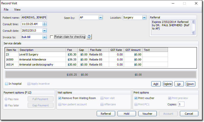 The 'Retain Claim for Checking' check box allows you to defer a selected Bulk Bill claim from the standard Medicare Easyclaim process to be batched later using Medicare Australia Online processing.