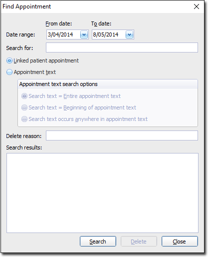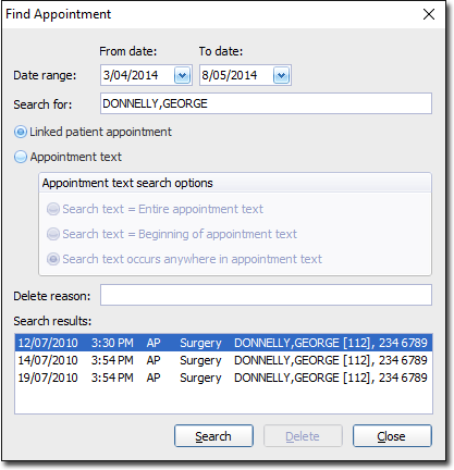 You can search by a patient's name, chart number, or by looking for specific text within the appointment. You can also search for deleted appointments.