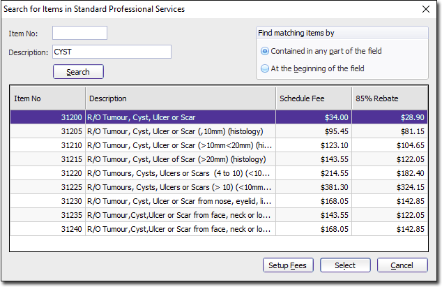 Pracsoft provides a facility for finding and selecting the Item Numbers for 'Standard Professional Services'. This is most useful when modifying service entries in the list of services on the Record Visit window.