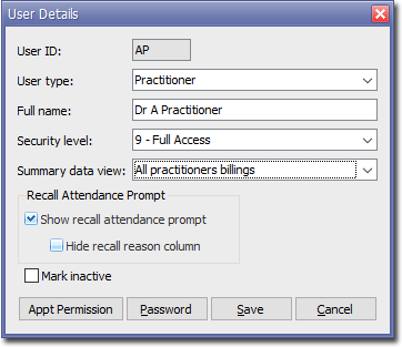 There are 9 security levels ranging from 'Read Only' to 'Unlimited Access'. Every Pracsoft user (practitioner or otherwise) must have a security level assigned to them, and at least one user must have 'Full Access' (level 9).