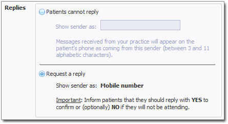 Indicate whether patients can reply i.e. if you want to request that they reply to your message in order to confirm their attendance at the appointment.