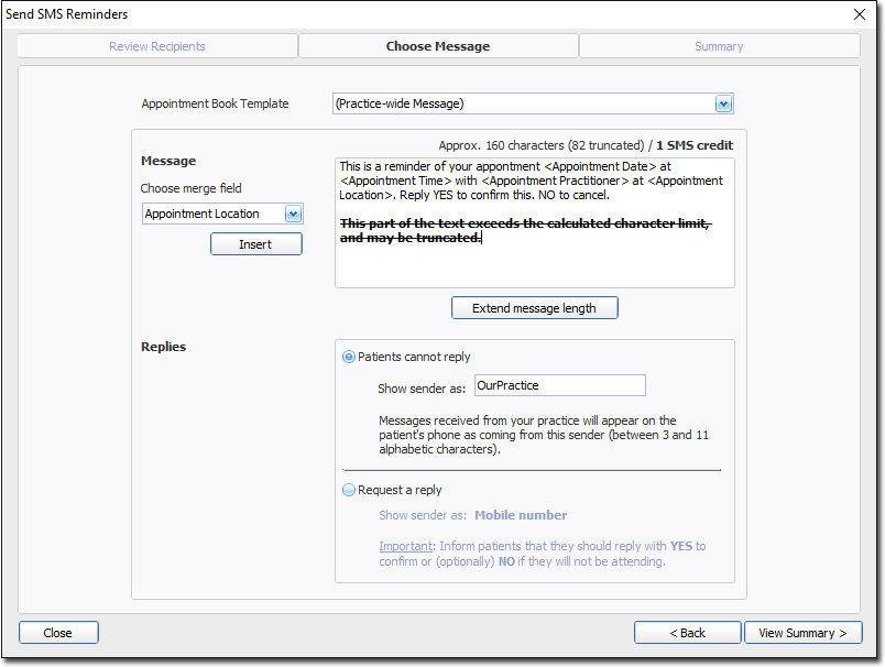 - If you elect that patients cannot reply, enter a description for the SMS sender e.g. "OUR_PRACTICE"
