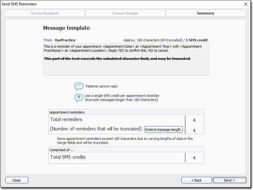 - (optional) Click Extend message length to ensure that the entire message is sent, as opposed to being truncated (the default). You will be notified of the number of SMS credits this will expend.
