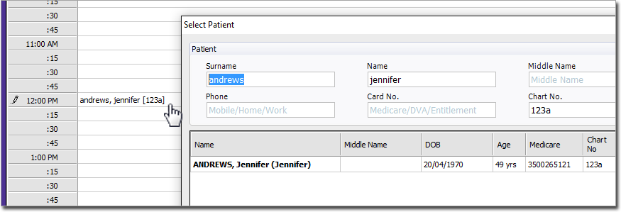 Alternatively, you can also search for patients using their Chart Number: enter [chart_number]. For example, enter Andrews, Jennifer [123a] to return the following: