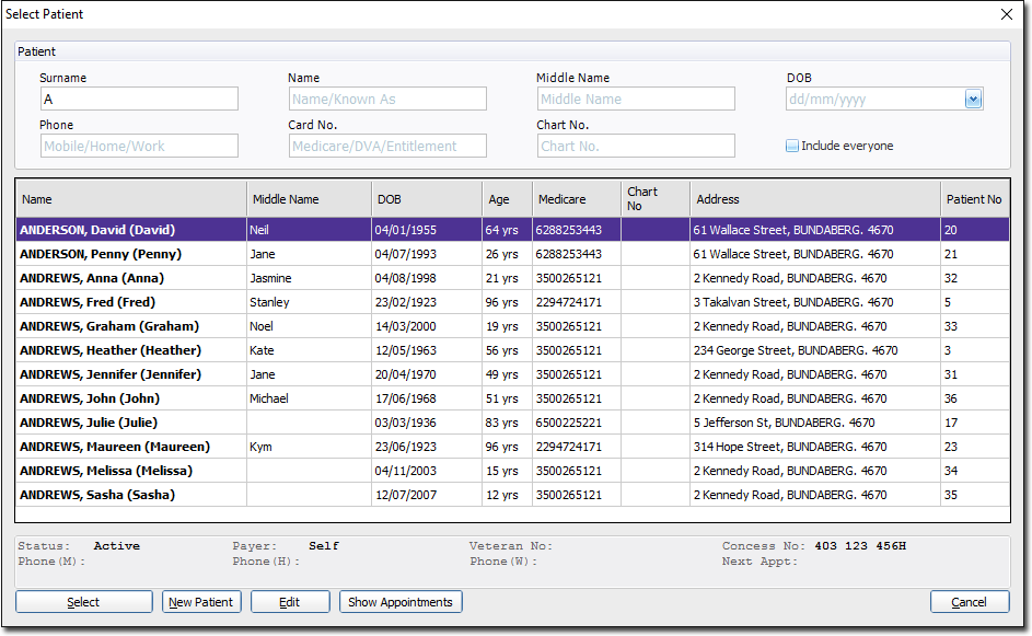 To check the patient's recorded appointment schedule, select the patient and click Show Appointments.