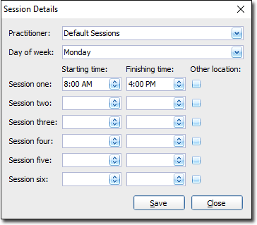 - Default Sessions, to create sessions for the entire selected Appointment Book. Note that default standard sessions override all practitioner-specific standard sessions. Therefore if you intend to create practitioner-specific standard sessions for even a single practitioner, there must be nothing recorded under 'default' sessions - all default session times must be left blank.