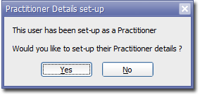 The Practitioner Details Set-up prompt appears. You will need to configure some practitioner settings for the entity account, so click