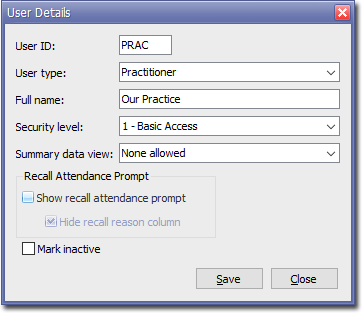 - Each User ID must be unique. As this is an 'entity' account for your Practice, a suggested ID could be 'Prac'.