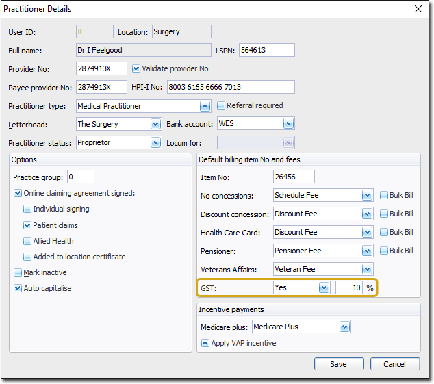 The Practitioner Details window appears. Via the GST drop-down list, select 'Yes', and then indicate the GST percentage rate, an example of which is shown below.