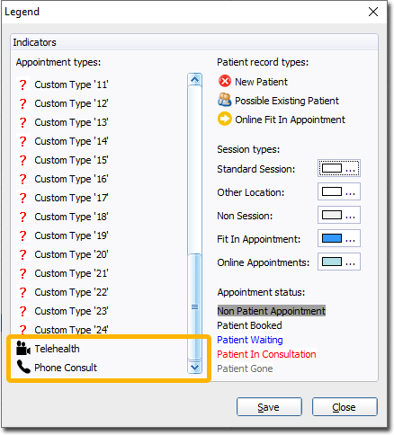 Telehealth in the Appointment Book Legend From within the Appointment Book, select View > Legend. Scroll to the bottom of the list of Appointment Types. See also: Appointment Book Legend