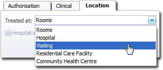When services are provided at either a residential care facility or community health centre, use 'Visiting' (home visit) in place of 'residential care facility' or 'community health centre'.