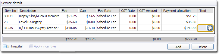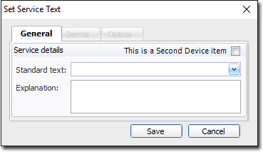 - For any given Standard Text you choose, you can further explain the selection by entering free-typed text in the Explanation text box. For example, if your patient has had two moles removed (and hence two Service Items recorded for their visit - one for each mole), you can use the Explanation text box to indicate which Service Item relates to which mole. It is important to note that you must not enter Explanation text if you have not also selected an entry from the Standard Text drop-down list - doing so will result in the claim being rejected during preparation. Note also, that you cannot enter Explanation text if you want to claim via Easyclaim.