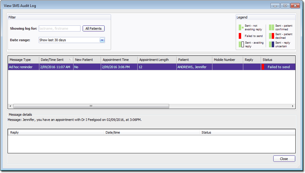 Confirm Patients are Not Receiving SMS Messages When a user tries to send an SMS for a patient who has opted out of SMS notification, the following message is displayed.