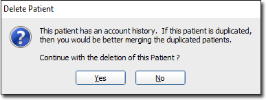 Patients with account history cannot be deleted. Rather, they are flagged as inactive. If you want to proceed with deactivating this patient, click Inactive patients can be reactivated if necessary.