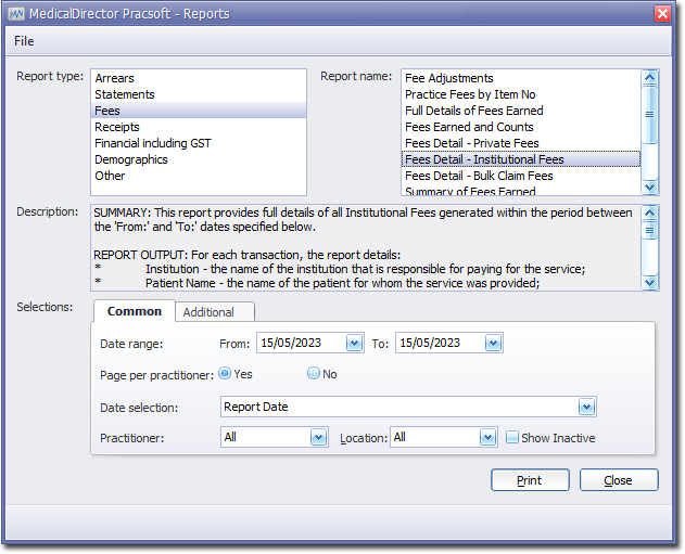 - Indicate whether results for each practitioner will be printed on separate pages.