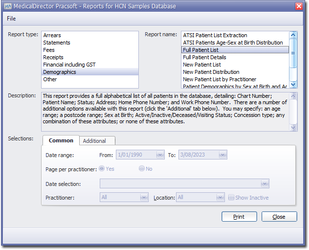 To Generate a Full Patient List Report Before you begin Procedure Select Reports > All Reports. The Pracsoft Reports window appears. Within the Report Type section, select Demographics. Within the Report Name section, select Full Patient List. Select the Additional tab. If desired, using the fields provided, enter criteria to filter the report on the following: Age Range Postcode Range Sex at Birth Status Concession Click Print when you are ready to proceed. Results