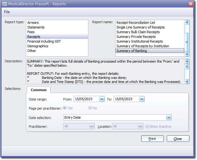 To Generate a Summary of Banking Report Before you begin Procedure Select Reports > All Reports. The Pracsoft Reports window appears. Within the Report Type section, select Receipts. Within the Report Name section, select Summary of Banking. Select the Common tab: Enter a Date Range for the report Via the Date Selection drop-down menu, indicate in which order you want the results displayed. Indicate which practitioner/s and location/s you want to limit the report to. Click Print when you are ready to proceed. Results