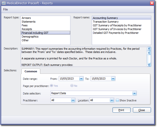 - Select . The Pracsoft Reports window appears.