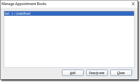 From within the Appointment Book, select Setup > Manage Appointment Books. The Manage Appointment Books window appears.