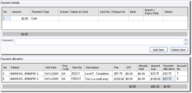 In the following example, the patient has credit of $100, and owes $33.70 in fees. Upon opening the Receipt window, the value at the Payment Allocation field for the credit entry would have read -$100. This value has then been manually modified until it matches the amount necessary to pay the fee items owed, entered as a negative value (in this case, -$33.70).