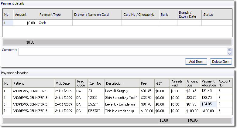 In the example above there are four entries in the Payment Allocation section; three service items with fees due, and one item of $100 credit. Notice also that Pracsoft assumes that the patient wantes to use the entirety of their credit to pay all of their outstanding fees, and in the example above Pracsoft has determined that after applying the available credit to the fees due, the patient will need to pay an outstanding balance of $46.85 (indicated in the Payment Details section). However, it is not compulsory to use the entirety of the available credit at this time, as explained following. -