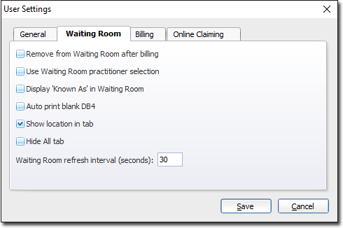| Remove from WaitRoom after billing | Select this check box so the patient's name clears from the Waiting Room window after their visit has been recorded. This helps ensure that a patient does not leave the medical centre without being billed for their visit. |